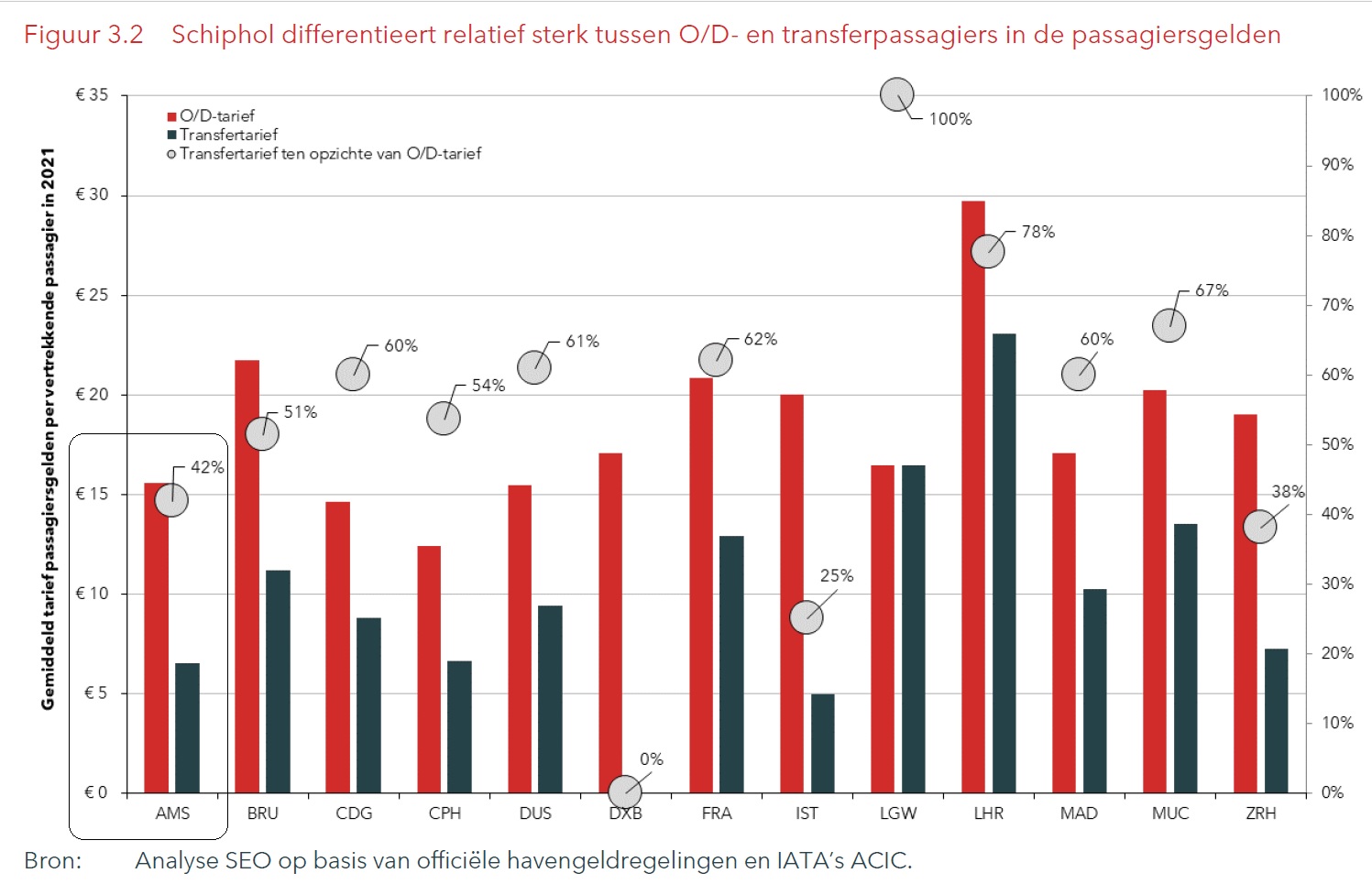 Uit een recent vergelijkend onderzoek blijkt dat transferpassagiers maar 42% van het tarief betalen van reguliere passagiers met bestemming- of herkomst Nederland. Dat betekent dat Nederlandse vakantiegangers de buitenlandse overstappers subsidiëren.